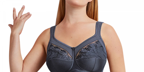 Бюстгальтер дает комфортную поддержку груди благодаря высоким боковым элементам и закрытой форме спереди. Широкие лямки эластичны, снимают нагрузку со спины и удобно регулируются по длине.