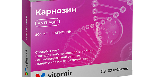 Карнозин — вещество, состоящее из двух аминокислот, вырабатывается и хранится в нервной ткани головного мозга, мышечных клетках и клетках сердца, отвечает за увеличение работоспособности клеток всего организма и предотвращение разрушения их мембран свободными радикалами, а также является мощным антиоксидантом. Форма выпуска: 30 таблеток массой 536 мг